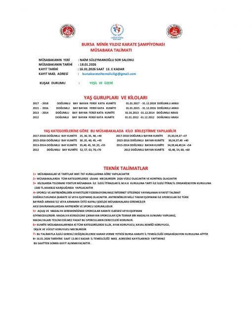 18 01 2026 pazar günü SPORA evet BAĞIMLIĞA hayır temalı bursa karate şampiyonası naim Süleyman oğlu spor kompleksinde yapılacaktır tüm hemşehrilerimiz davetlidir spor bir hobi değil spor çocuklarımız için bir ihtiyaçtır hep birlikte geleceğimiz olan